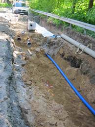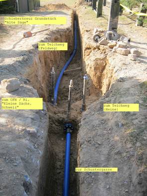 Durch die Mitarbeiter des Trinkwasserzweckverbandes wurden zum Teil neue Trinkwasserleitungen verlegt. Das betraf hauptsächlich den 1. Bauabschnitt zwischen dem Weg zur Lochmühle und Ortsausgang in Richtung Liebethal.