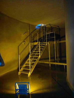 Bevor diese aufgetragen werden konnte, mussten die alte, inzwischen stark sandende Putzschicht vollständig abgetragen und die Fugen im Boden ausgestemmt werden. Da die Überprüfung der Tragfähigkeit von Decke, Wänden und Boden teilweise ungenügende Werte ergab, wurde die Verankerung von Edelstahlmatten an den Wänden notwendig. Nun erst konnte mit dem mehrlagigen Auftragen der neuen Mineralbeschichtung begonnen werden. Zum Abschluss wurden noch die Treppenanlage und der Einstiegsbereich entsprechend den geltenden Vorschriften erneuert.